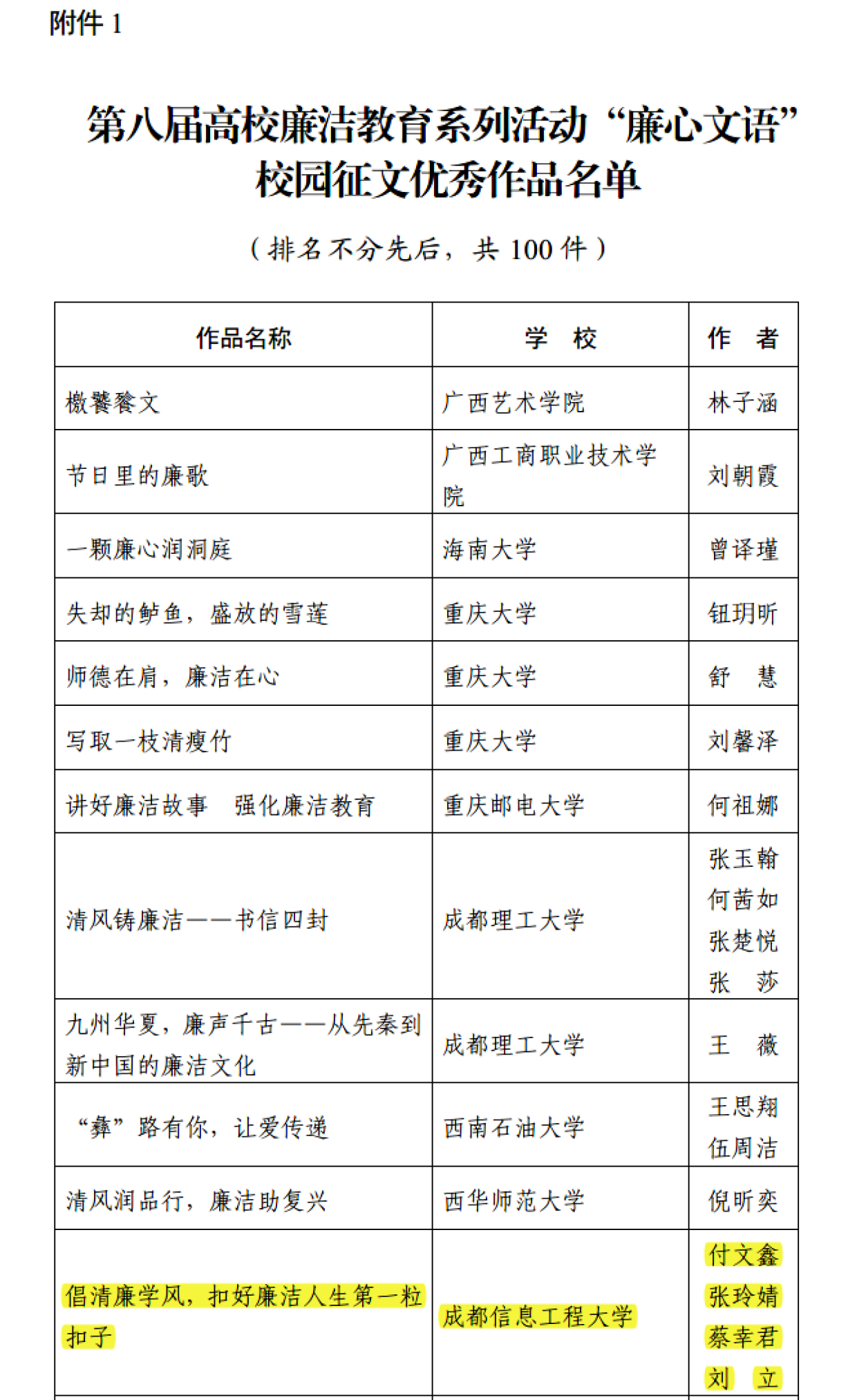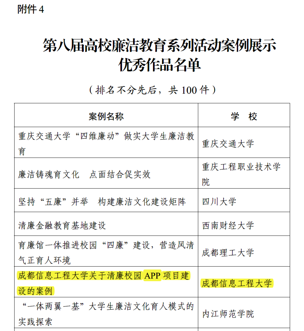 近日,由教育部办公厅主办的“廉洁润初心 铸魂担使命——第八届高校廉洁教育系列活动”评选结果公布,由学校纪委牵头报送的“清廉校园APP项目”被评为案例展示优秀作品,由我校党委宣传部推荐报送的征文作品《倡清廉学风,扣好廉洁人生第一粒扣子》被评为校园征文优秀作品,入选项目数位列四川省内高校第三。